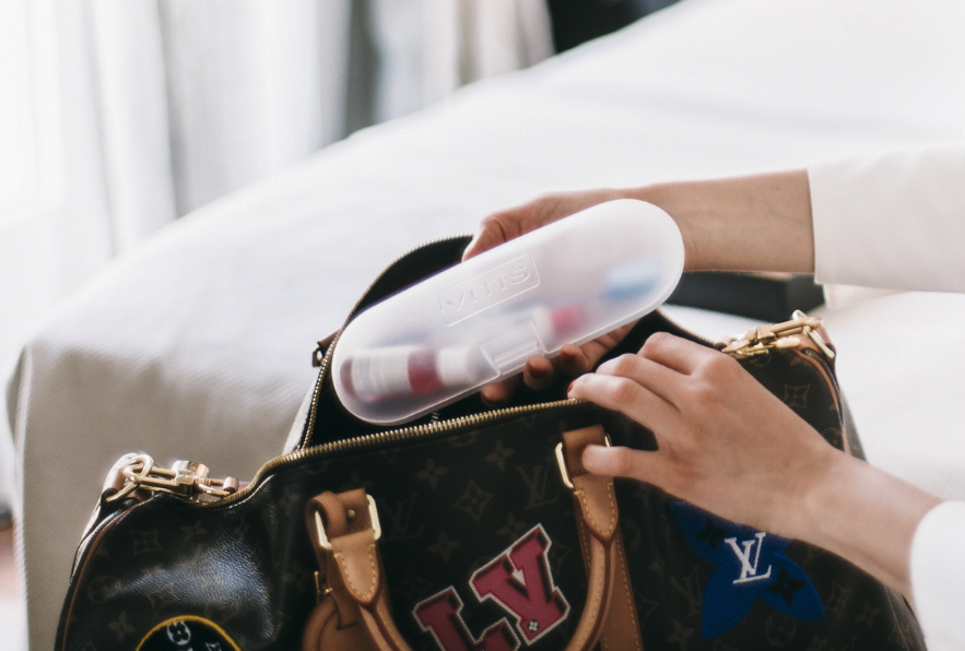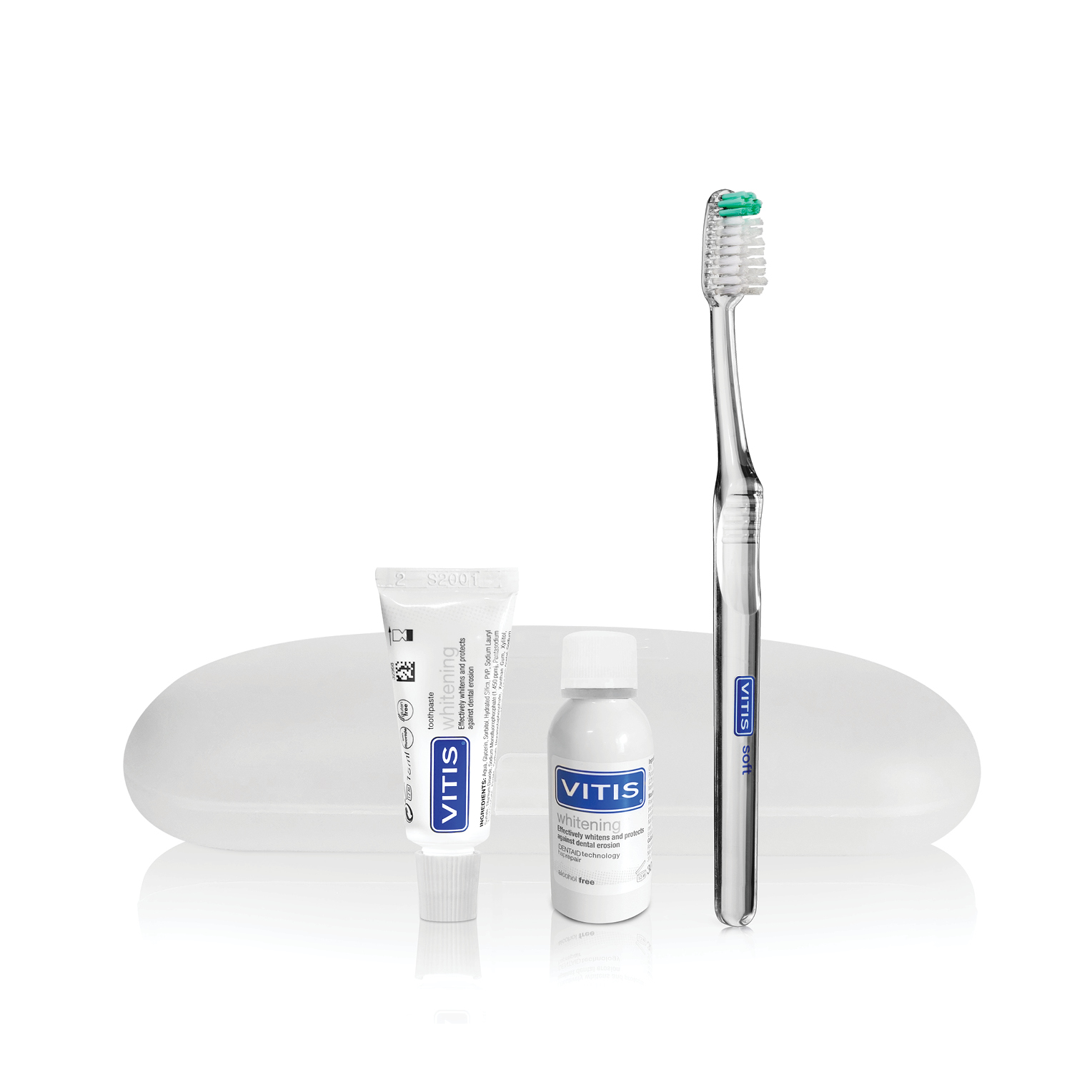 Idealno za ponijeti sa sobom na put. Plastična pernica sa putnim pakiranjima proizvodima VITIS WHITENING linije za kompletnu oralnu higijenu.